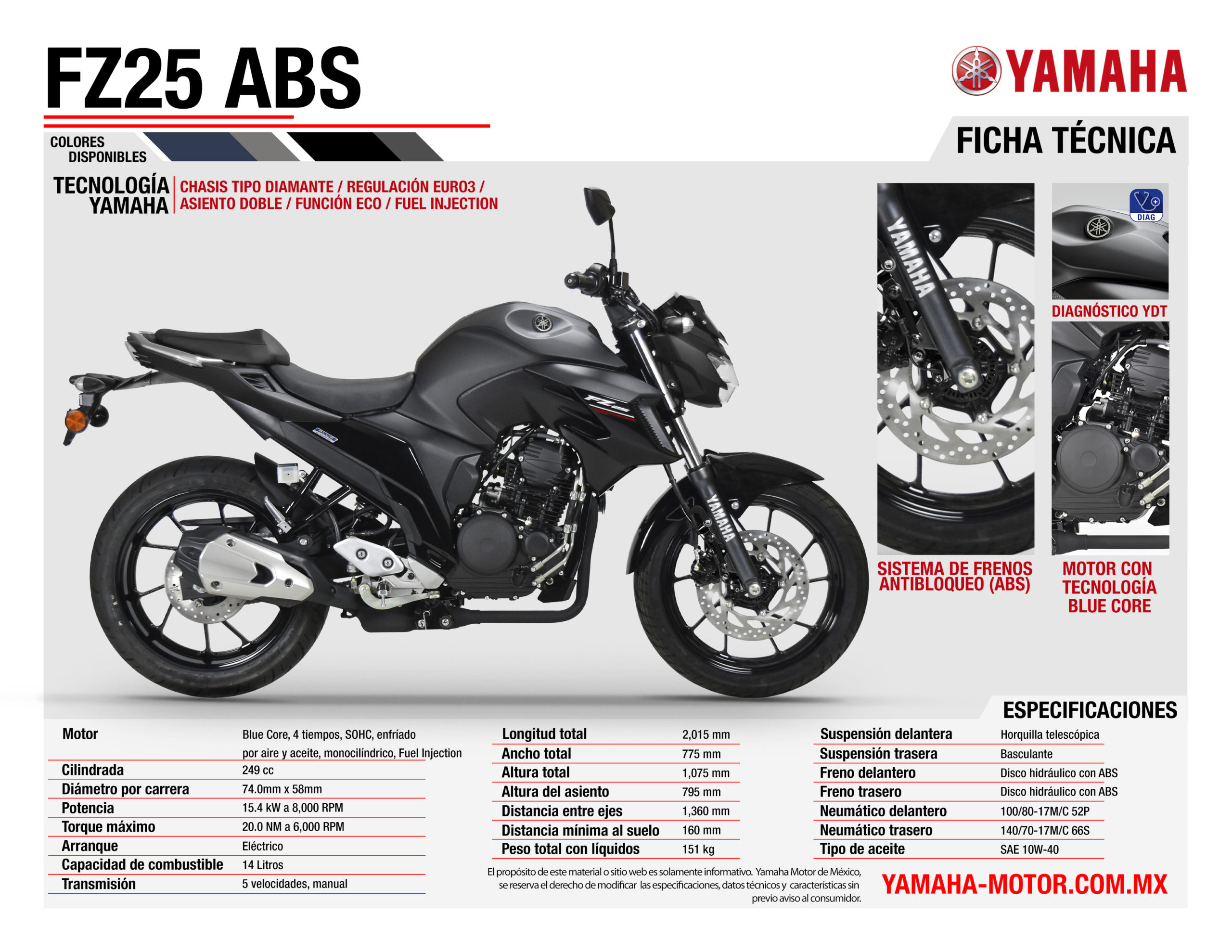La más potente de la serie FZ. La nueva FZ25 ABS combina diseño, seguridad y un óptimo rendimiento. Está diseñada bajo el concepto Blue Core, que proporciona gran rendimiento y eficiencia de consumo de combustible. Posee freno de disco con ABS en ambas ruedas. Su chasis tipo diamante junto con la suspensión y su escape hacen que sea un modelo maniobrable, equilibrado y ágil.